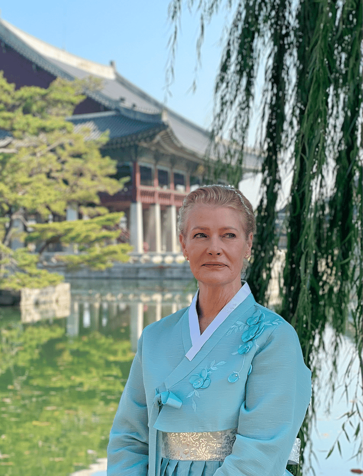 Wearing a hanbok at Gyeongbokgung Palace during a DNK community event